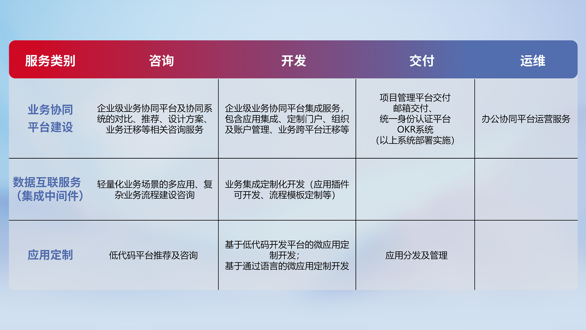 针对钉钉、、企微、、、、IDaas等平台级产品提供产品的规划、、方案、、、交付、、、定制化开发等服务,,,实现如统一协同办公、、智能客户服务、、混合会议管理、、、、智能数据查询、、、、等业务场景,,,,实现数字化转型。。。。